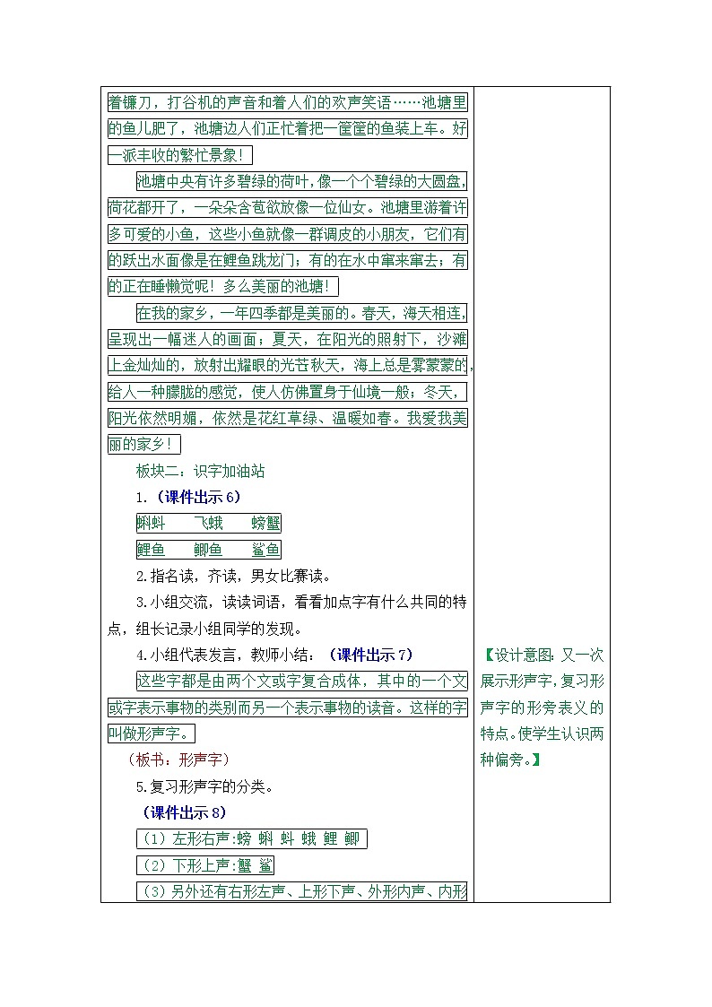 1.找出中心句及其在文中可能出现的位置,认识表示动物的词语,及带有虫字旁和鱼字旁的字。