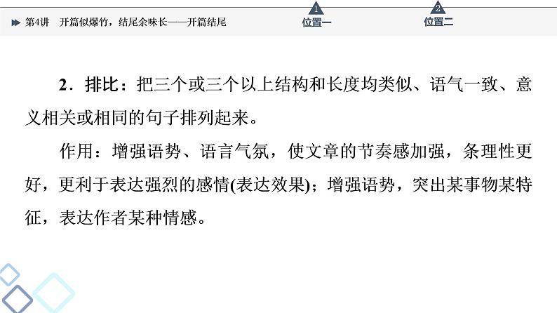 这是一份第6部分 专题2 第4讲 开篇似爆竹,结尾余味长——开篇结尾课件PPT,共43页。PPT课件主要包含了位置一开篇手法,位置二结尾方式等内容,欢迎下载使用。