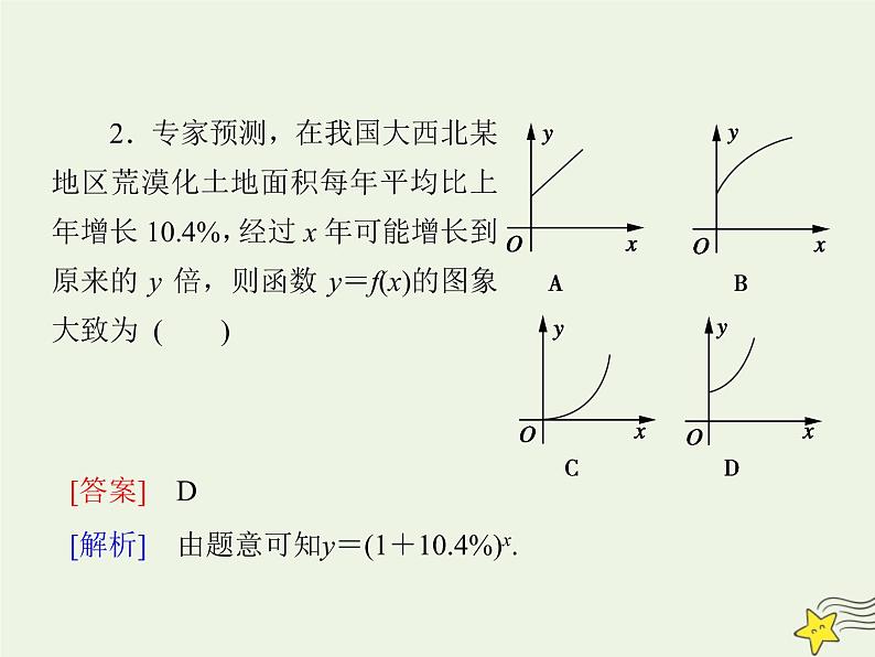 [答案] D[解析] 由几类不同增长的函数特性可知,y=32x呈指数“爆炸式”增长,速度最快.