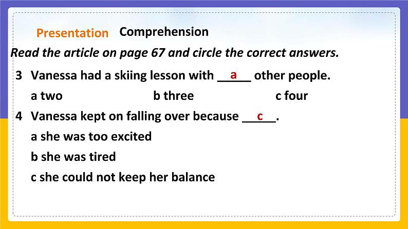 3Vanessa had a skiing lessn with _____ ther peple.a twb threec fur4Vanessa kept n falling ver because _____.a she was t excitedb she was tiredc she culd nt keep her balance