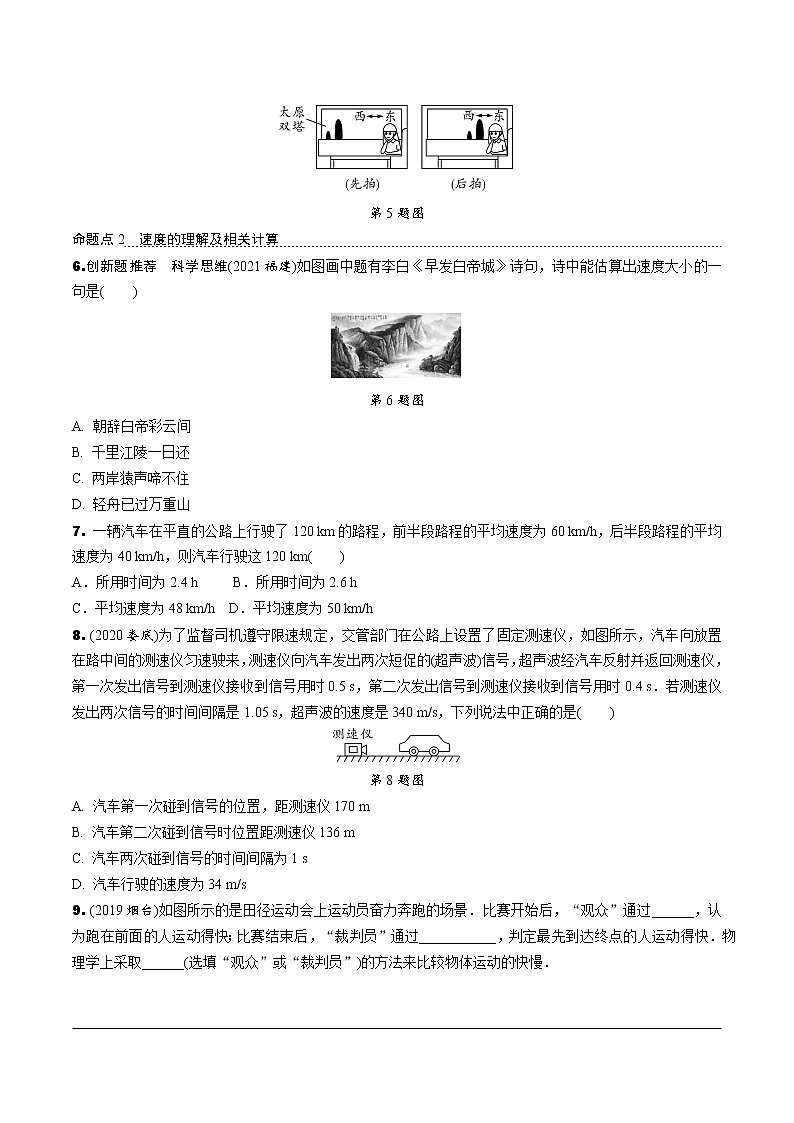 (1)在比赛过程中,看台上的观众认为小明跑得快,这是依据相同时间比________的方法;比赛结束时,裁判认为用时少的同学跑得快,这是采用________________的方法. (2020雅安4题改编)