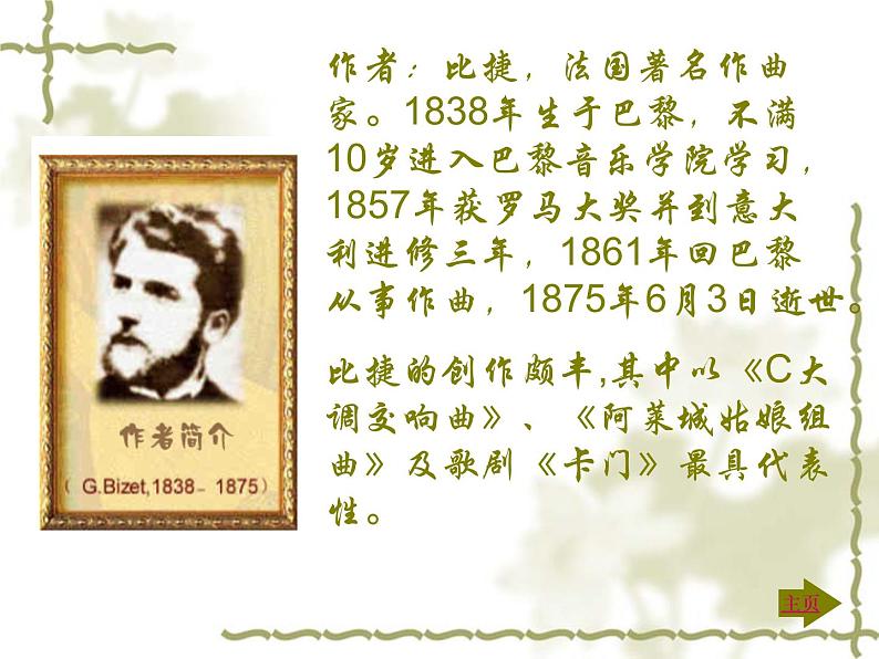 作者:比捷,法国著名作曲 家。1838年生于巴黎,不满10岁进入巴黎音乐学院学习,1857年获罗马大奖并到意大利进修三年,1861年回巴黎从事作曲,1875年6月3日逝世。比捷的创作颇丰,其中以《C大调交响曲》、《阿莱城姑娘组曲》及歌剧《卡门》最具代表性。