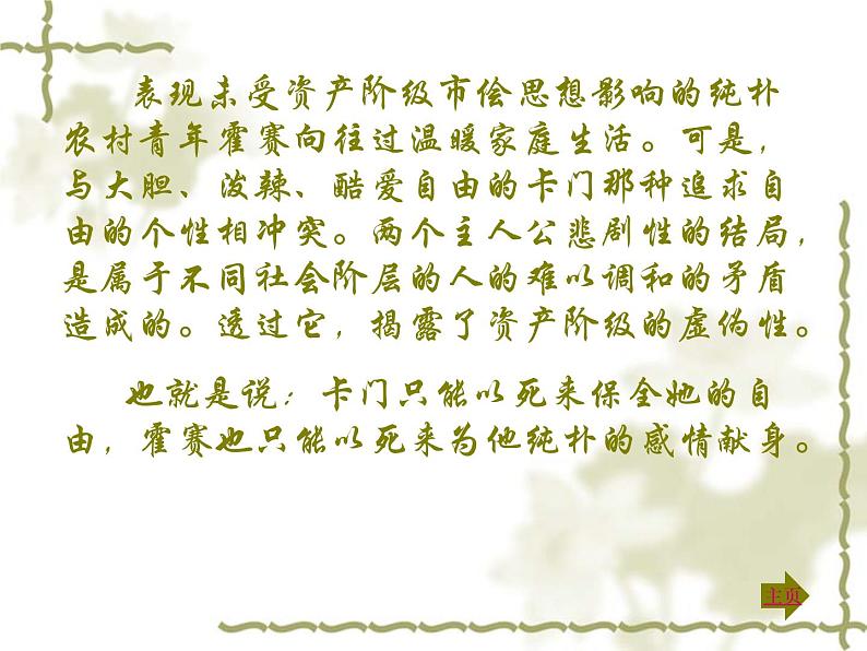 表现未受资产阶级市侩思想影响的纯朴农村青年霍赛向往过温暖家庭生活。可是,与大胆、泼辣、酷爱自由的卡门那种追求自由的个性相冲突。两个主人公悲剧性的结局,是属于不同社会阶层的人的难以调和的矛盾造成的。透过它,揭露了资产阶级的虚伪性。 也就是说:卡门只能以死来保全她的自由,霍赛也只能以死来为他纯朴的感情献身。