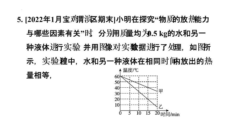5. [2022年1月宝鸡渭滨区期末]小明在探究“物质的放热能力与哪些因素有关”时,分别用质量均为0.5 kg的水和另一种液体进行实验,并用图像对实验数据进行了处理,如图所示,实验过程中,水和另一种液体在相同时间内放出的热量相等,