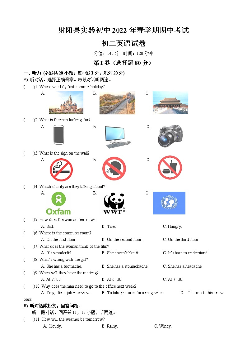 这是一份江苏省盐城市射阳县实验初级中学2021-2022学年八年级下学期期中考试英语试卷(含答案),共9页。试卷主要包含了听力,单项选择,完形填空,阅读理解,词汇,书面表达等内容,欢迎下载使用。