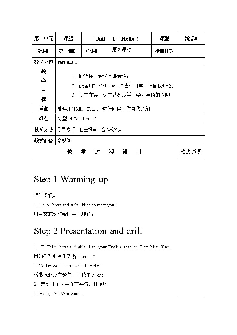 2、能运用“Hell! I’m….”进行问候、作自我介绍;