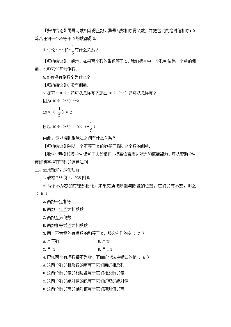 1.5.2 有理数的除法第1课时 有理数的除法教学目标【知识与技能】了解有理数除法的意义,理解有理数的除法法则,会进行有理数的除法运算,会求有理数的倒数.【过程与方法】经历探索发现有理数除法法则的过程,增强观察、归纳、猜想、验证、表达能力.【情感态度】会把有理数除法转化为有理数乘法,培养学生的化归思想.【教学重点】除法法则和倒数概念.【教学难点】对零不能作除数与零没有倒数的理解以及除法的运算方法.教学过程一、情景导入,初步认知1.有理数的乘法法则如何叙述?2.运用有理数乘法法则,请同学们回答下列各题计算结果:(1)(-2)×3; (2)4×(-1/4);(3)(-7)×(-3); (4)6×(-8);(5)(-6)×(-8); (6)(-3)×0.3.已知两个因数的积和其中一个因数,要求另一个因数,应该用什么运算进行计算呢?【教学说明】复习巩固有理数的乘法法则,为本节课有理数除法的应用做准备工作,利用提问及回答,引出本节课的课题:有理数的除法.二、思考探究,获取新知1.8÷4是什么运算?商等于多少?0÷4等于多少?2.请同学们想一想,分析讨论计算以下各题:(-6)÷3=? 6÷(-3)=? (-6)÷(-3)=?3.观察以上算式,看看商的符号及商的绝对值与被除数和除数有何关系?如果有,请大家从特例中归纳猜想出一般规律,并用自己的语言叙述规律.【教学说明】用算术数除法类比有理数除法,从而明确除法是乘法的逆运算,且在有理数范围内也适用.通过这一系列的活动,为学生从特例中归纳猜想得出有理数的除法法则作好了充分的铺垫工作.【归纳结论】同号两数相除得正数,异号两数相除得负数,并把它们的绝对值相除;0除以任何一个不等于0的数都得0.4.讨论:-5和-有什么关系?【归纳结论】一般地,如果两个数的乘积等于1,我们把其中一个数叫做另一个数的倒数,也称它们互为倒数.5.0有没有倒数?为什么?【归纳结论】0没有倒数.6.探究:10÷5还可以怎样算?那么10÷(-5)还可以怎样算?因为10÷(-5)=-210×(-)=-2所以10÷(-5)=10×(-)由此,你能得到乘除法之间有什么关系?【归纳结论】除以一个不等于0的数等于乘以这个数的倒数.【教学说明】培养学生课堂主人翁精神,提高语言表达能力和概括能力,可以帮助学生更好地掌握有理数的运算法则.三、运用新知,深化理解1.教材P35例4、P36例5.2.两个不为零的有理数相除,如果交换被除数与除数的位置,它们的商不变,那么( D )A.两数一定相等B.两数一定互为相反数C.两数互为倒数D.两数相等或互为相反数3.两个不为零的有理数的和等于0,那么它们的商( C )A.是正数 B.是零C.是-1 D.是±14.已知两个有理数都不为零,下面的说法中错误的是( A )A.这两个数的相反数的商等于它们商的相反数B.这两个数的差的相反数等于它们相反数的差C.这两个数的绝对值的积等于它们的积的绝对值D.这两个数的商的绝对值等于它们绝对值的商5.(1)-0.2的相反数为 ,倒数是 .(2)若一个数的倒数为,则这个数的相反数为 .(3)一个数与它的倒数相等,那么这个数是 .(4)若一个数的绝对值为4,则这个数的倒数为 .答案:(1)0.2,-5 (2) (3)±1 (4)±6.计算下列各式: 【教学说明】复习巩固检测本节知识,训练提高运算技能,应用有理数运算解决实际问题.四、师生互动、课堂小结先小组内交流收获和感想而后以小组为单位派代表进行总结.教师作以补充.课后作业布置作业:教材“习题1.5”中第6、7、8题.教学反思数学的教学活动必须建立在学生的认识发展水平和已有的知识经验基础上,本节课正是考虑和分析到了这一事实,向学生提供了充分从事数学活动的机会,帮助学生在自主探索和合作交流的过程中真正理解和掌握有理数的除法法则,并在活动中获得了一定的数学活动经验.要关注学生数学学习的过程以及在数学活动中所表现出来的态度,帮助学生建立信心,展示自我.