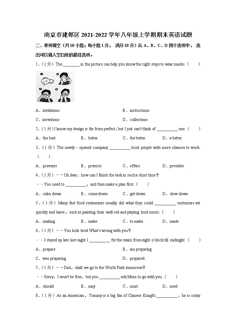 南京市建邺区2021-2022学年八年级上学期期末英语试题(含解析)