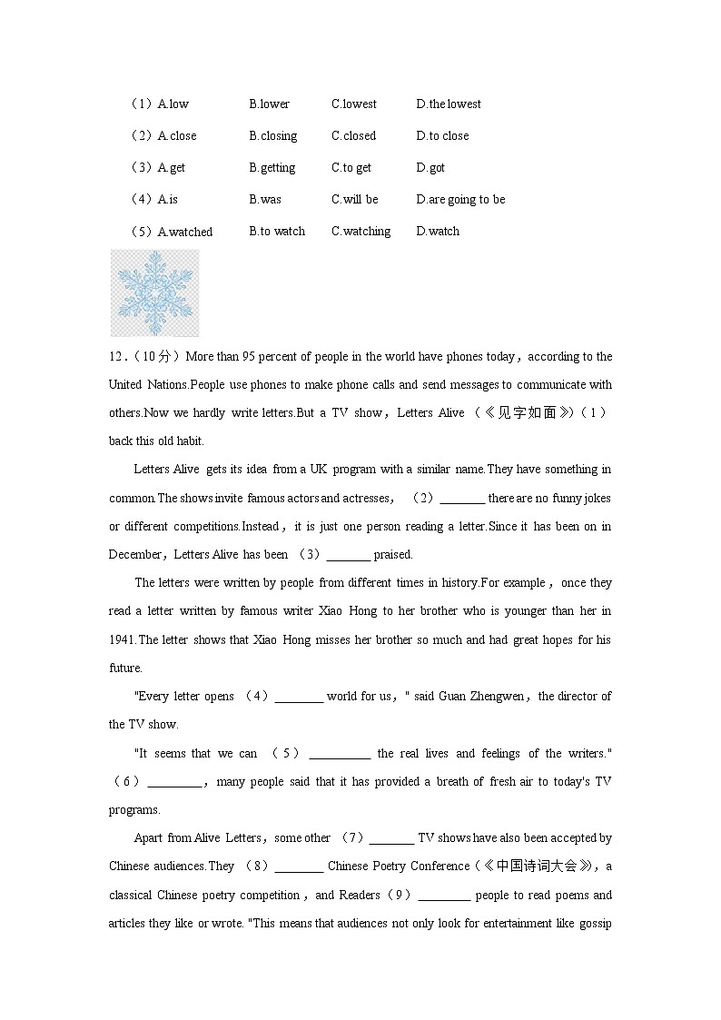 12.(10分)More than 95 percent of people in the world have phones today,according to the United Nations.People use phones to make phone calls and send messages to communicate with others.Now we hardly write letters.But a TV show,Letters Alive(《见字如面》)(1) back this old habit.