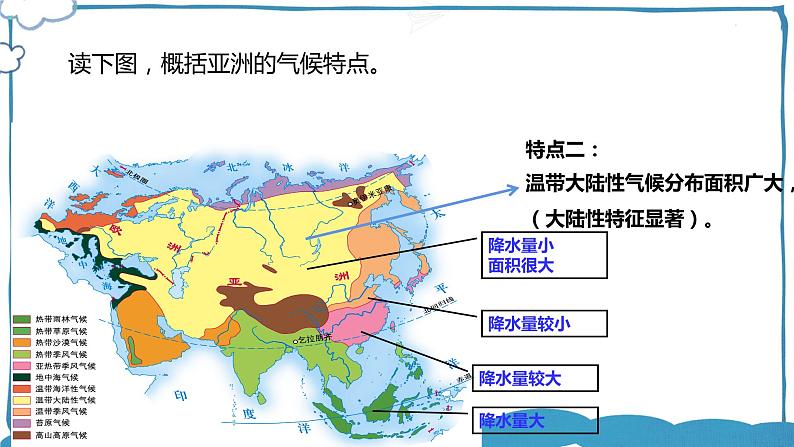 读图找出亚洲主要的气候类型。想一想,为什么亚洲气候类型众多?