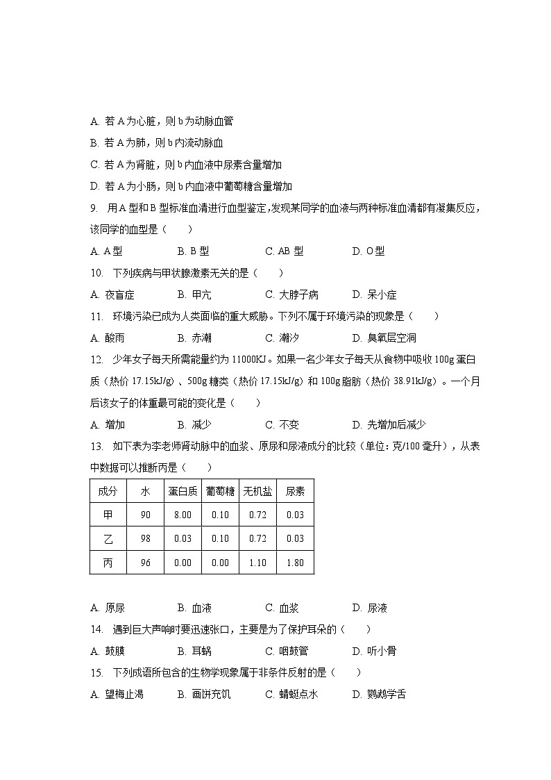 8. 如图为人体某器官血流情况模式图,A为器官,a、b为血管,箭头为血流方向,下列分析错误的是( )