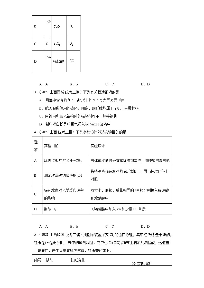 山西高考化学三年(2021-2023)模拟题汇编-04卤素及其化合物
