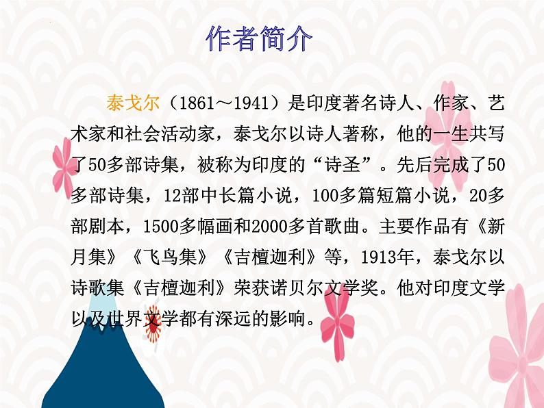 泰戈尔(1861~1941)是印度著名诗人、作家、艺术家和社会活动家,泰戈尔以诗人著称,他的一生共写了50多部诗集,被称为印度的“诗圣”。先后完成了50多部诗集,12部中长篇小说,100多篇短篇小说,20多部剧本,1500多幅画和2000多首歌曲。主要作品有《新月集》《飞鸟集》《吉檀迦利》等,1913年,泰戈尔以诗歌集《吉檀迦利》荣获诺贝尔文学奖。他对印度文学以及世界文学都有深远的影响。