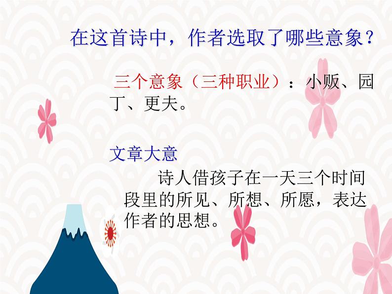 三个意象(三种职业):小贩、园丁、更夫。文章大意 诗人借孩子在一天三个时间段里的所见、所想、所愿,表达作者的思想。