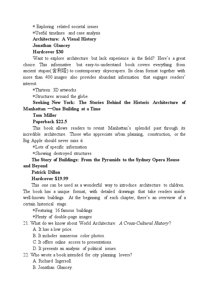 Want t explre architecture but lack experience in the field? Here’s a great chice. This infrmative but easy-t-understand bk cvers everything frm ancient stupas(舍利塔) t cntemprary skyscrapers. Its clean frmat tgether with mre than 400 images als prvides abundant infrmatin that engages readers’ interest.