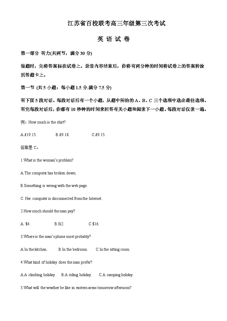 2023届江苏省百校联考高三第三次考试英语试题及答案: 这是一份2023届江苏省百校联考高三第三次考试英语试题及答案,共22页。试卷主要包含了5分,15等内容,欢迎下载使用。