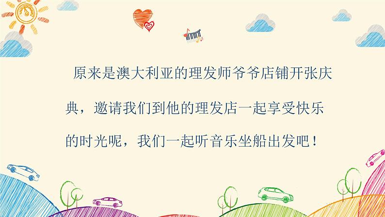 原来是澳大利亚的理发师爷爷店铺开张庆典,邀请我们到他的理发店一起享受快乐的时光呢,我们一起听音乐坐船出发吧!