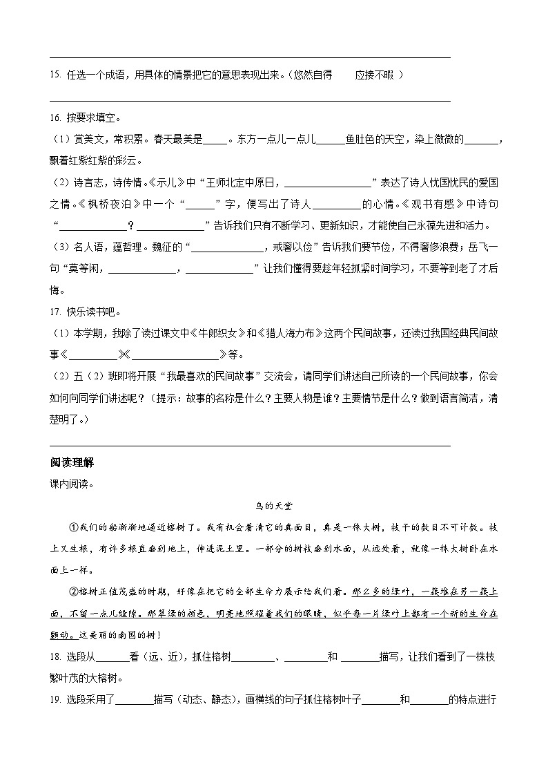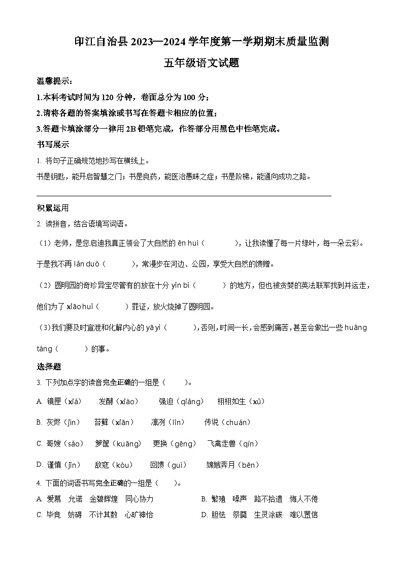 2023-2024学年贵州省铜仁市德江县部编版五年级下册期中考试语文试卷(原卷版+解析版): 这是一份2023-2024学年贵州省铜仁市德江县部编版五年级下册期中考试语文试卷(原卷版+解析版),文件包含2023-2024学年贵州省铜仁市德江县部编版五年级下册期中考试语文试卷原卷版docx、2023-2024学年贵州省铜仁市德江县部编版五年级下册期中考试语文试卷解析版docx等2份试卷配套教学资源,其中试卷共16页, 欢迎下载使用。