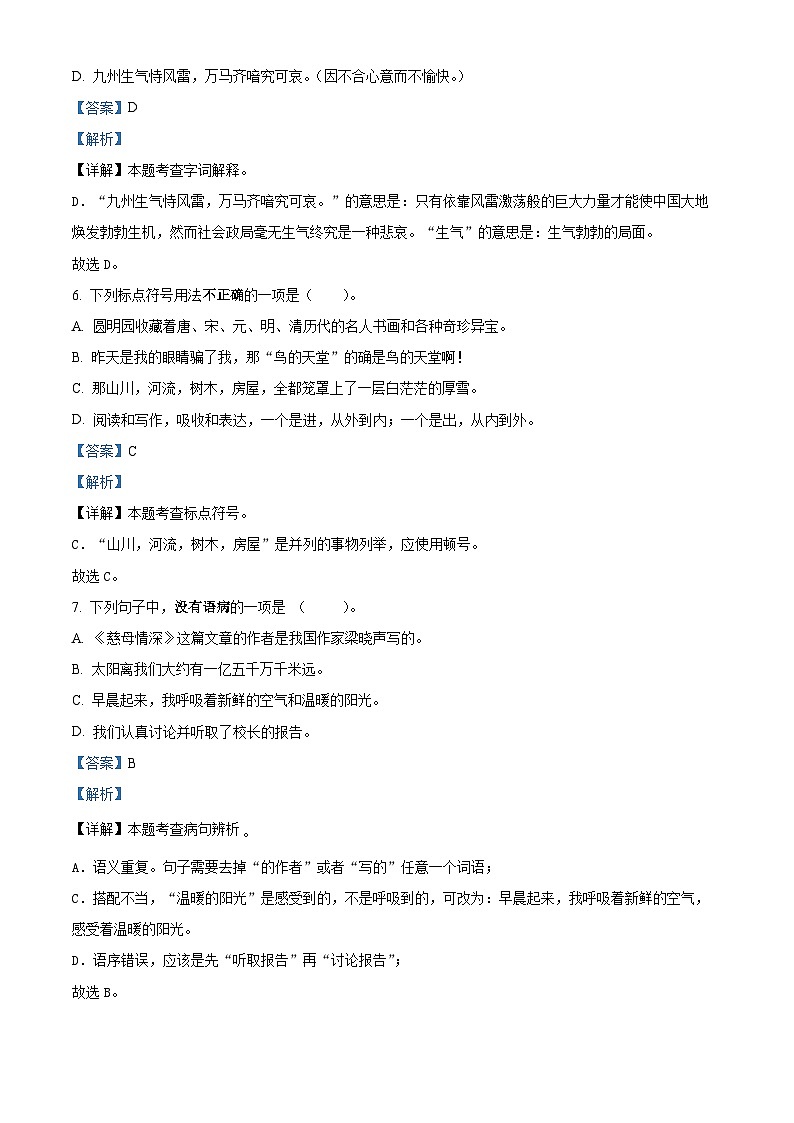 D.“九州生气恃风雷,万马齐喑究可哀。”的意思是:只有依靠风雷激荡般的巨大力量才能使中国大地焕发勃勃生机,然而社会政局毫无生气终究是一种悲哀。“生气”的意思是:生气勃勃的局面。