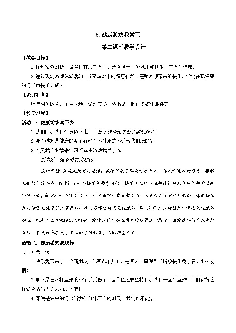 这是一份小学政治 (道德与法治)人教部编版二年级下册5 健康游戏我常玩教学设计,共5页。教案主要包含了教材与学情分析,教学目标,教学重点和难点,教学准备,教学过程预设,板书设计等内容,欢迎下载使用。