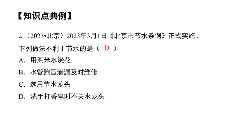 第四单元 自然界的水单元复习知识结构知识点讲解0102知识点典例03知识结构自然界的水水资源状况爱护水资源爱护水资源净水方法软水和硬水水的净化实验探究物质的分类水的组成化学式化合价化学式与化合价意义读写规律应用相关计算0知识点1:爱护水资源1.原因:(1)地球表面71%被水覆盖,但供人类利用的淡水量小于1%。(2)人类生活、生产用水量不断增加,水污染状况严重,导致水资源更短缺。知识点1:爱护水资源2.措施国家节水标志一水多用循环使用处理达标集中处理【知识点典例】1.根据如图全球海水、陆地水储量比,下列说法错误的是( )A .地球上大部分是含盐量很高的海水B.淡水资源是取之不尽,用之不竭的C.为减少水体污染,农药、化肥要合理使用D.为节约用水,农业、园林浇灌改大水漫灌为喷灌、滴灌B【知识点典例】2.(2023•北京)2023年3月1日《北京市节水条例》正式实施。下列做法不利于节水的是( )A.用淘米水浇花 B.水管跑冒滴漏及时维修 C.选用节水龙头 D.洗手打香皂时不关水龙头D知识点2:净水方法絮凝剂过滤知识点2:净水方法吸附物理化学沸点除去不溶性杂质吸附沉降,除去可溶性的色素、异味用ClO2、Cl2杀细菌、病毒。吸附水中悬浮的杂质沉降杂质自来水厂净水过程过滤:将不溶性固体与液体分离一贴①滤纸紧贴漏斗内壁(用水润湿滤纸)②液面低于滤纸边缘①滤纸边缘低于漏斗边缘二低三靠①烧杯口紧靠玻璃棒②玻璃棒斜靠三层滤纸处③漏斗下端管口紧靠烧杯内壁知识点3:硬水和软水1.定义:_______:含有较多可溶性钙、镁化合物的水。_______:不含或含较少可溶性钙、镁化合物的水。2.鉴别方法:加入_______,振荡,产生浮渣较多泡沫较少的是______,产生浮渣较少、泡沫较多的是_______。3.硬水软化的方法:(1)生活中常用_________的方法;(2)实验室用_________的方法。肥皂水硬水软水硬水软水煮沸蒸馏【知识点典例】1.(2023•江西)再生水是指废水经处理后达到一定指标的水,其生产工序中活性炭的主要作用是( )A.沉降 B.吸附 C.消毒 D.乳化2.(2023·荆州)常用来区分硬水和软水的试剂是( )A.食盐水 B.肥皂水 C.蔗糖水 D.蒸馏水BB【知识点典例】3.(2023•广安改编)学习了水的净化后,某同学利用课外时间自制了简易净水器(如图所示),下列说法不正确的是( ) A.该装置能除去水中的色素和异味 B.硬水经过该装置后可转化成软水 C.装置中的小卵石和石英砂起过滤作用 D.经过该装置净化后的水仍是混合物B知识点4:水的组成的探究无色无臭气体比空气的小难溶于水1.氢气氢气中混有空气或氧气遇明火会发生爆炸,因此氢气在点燃前一定要检验其_________。尖锐的爆鸣声表明不纯,声音很小表明较纯纯度知识点4:水的组成的探究2.氢气的燃烧现象:产生_____色火焰,放出大量热,烧杯内壁凝结有_____。 反应表达式:实验结论:水是由_________________组成的。理论依据:化学反应前后_____________不变。淡蓝水雾氢、氧两种元素元素种类知识点4:水的组成的探究3.电解水实验现象:接通直流电源后,电极上有_____产生,一段时间后,与___极相连的玻璃管内气体和与___极相连的玻璃管内的气体体积比约为_______。产物检验:在正极端玻璃管口放一根带火星的木条,木条复燃,证明是______;在负极端玻璃管口放一根燃着的木条,气体燃烧,发出淡蓝色的火焰,证明是______。气泡正负1∶2O2H2知识点4:水的组成的探究3.电解水实验反应表达式:实验结论:水是由_________________组成的。理论依据:化学反应前后_____________不变。氢、氧两种元素元素种类知识点4:水的组成的探究【特别提醒】①电解水实验可以巧记为“正氧负氢、氢二氧一”。②电解水时,向水中添加少量的稀硫酸或氢氧化钠溶液,目的是为了增强水的导电性。③电解水时,若氧气与氢气的体积比小于1:2,可能的原因有:氧气在水中的溶解性比氢气稍大;氧气具有氧化性,部分氧气将电极氧化而消耗;正极未完全放入玻璃管中,使氧气泄漏等。④电解水时电能转化为化学能。【知识点典例】1.(2023•益阳)如图是通电一段时间后电解水的装置示意图。下列说法错误的是( ) A.产生的气体a能使带火星的木条复燃 B.产生气体b的一端电极与电源正极相连 C.水中加入少量Na2SO4可以增强其导电性 D.该实验证明水是由氢、氧两种元素组成的A【知识点典例】2.下列关于氢气的说法不正确的是( )A.同温同压时,氢气密度比空气小B.氢气燃烧产生明亮的蓝紫色火焰C.氢气燃烧不会产生污染物D.氢气在点燃前需检验纯度B知识点5:物质的分类物质纯净物混合物由同种元素组成的纯净物,如氢气(H2) 、氧气(O2)由不同种元素组成的纯净物,如水(H2O)由两种元素组成,其中一种是氧元素的化合物,如水(H2O)【特别提醒】①由同种元素组成的物质不一定是单质,如含O2和O3的混合物;②含氧元素的物质不一定是氧化物,如O2和KClO3等。【知识点典例】1.(2023·雅安)下列物质属于氧化物的是( )O2 B.AgNO3C. H2SiO3 D. H2O2D【知识点典例】2.超市里有成百上千种商品,为了便于顾客选购,往往分门别类,有序地摆放。在化学学习中,我们也要将物质进行分类。请将下列物质按要求分类。( 用序号填空)①空气 ②二氧化硫( SO2) ③氧气(O2) ④硫粉( S )⑤冰水混合物 ⑥海水 ⑦氯酸钾(KClO3)(1)属于混合物的是__________; (2)属于纯净物的是__________;(3)属于化合物的是__________; (4)属于单质的是__________。②③④⑤⑦①⑥②⑤