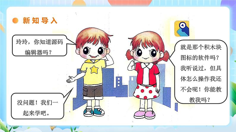 知道源码编辑器的主要界面组成了解角色造型,会搭建程序让角色动起来会“从素材库中选择角色”了解复制角色程序的方法