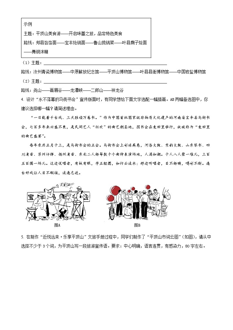 4. 设计“永不落幕的马街书会”宣传版面时,有同学想给下面文字选配一幅插画。AB两幅备选图中,你建议选择哪一幅?请简述理由。