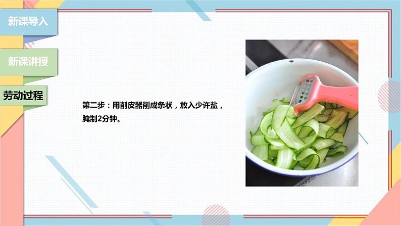第二步:用削皮器削成条状,放入少许盐,腌制2分钟。