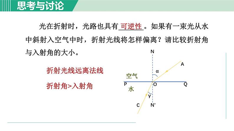 光在折射时,光路也具有_______。如果有一束光从水中斜射入空气中时,折射光线将怎样偏离?请比较折射角与入射角的大小。