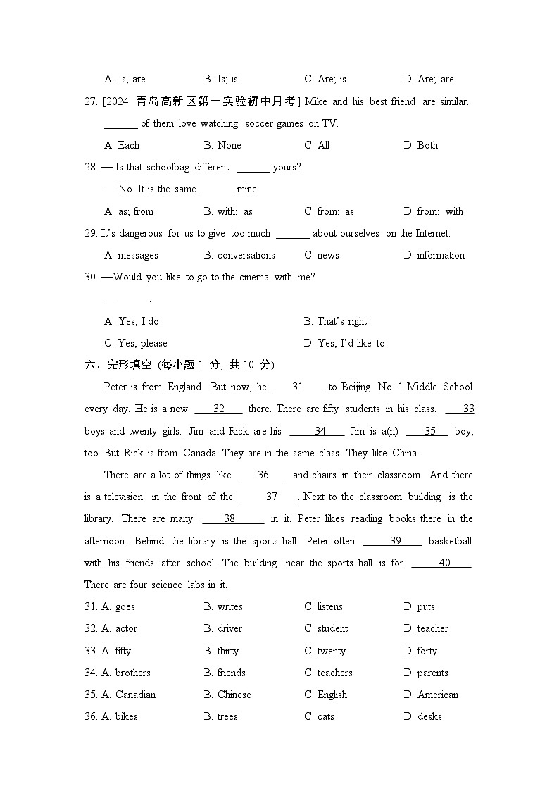 Peter is frm England. But nw, he 31 t Beijing N. 1 Middle Schl every day. He is a new 32 there. There are fifty students in his class, 33 bys and twenty girls. Jim and Rick are his 34 . Jim is a(n) 35 by, t. But Rick is frm Canada. They are in the same class. They like China.