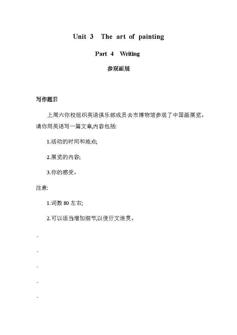 Unit 3 The art of paintingPart 4 Writing参观画展写作题目 上周六你校组织英语俱乐部成员去市博物馆参观了中国画展览。请你用英语写一篇文章,内容包括:1.活动的时间和地点;2.展览的内容;3.你的感受。注意:1.词数80左右;2.可以适当增加细节,以使行文连贯。 思路点拨遣词造句Ⅰ.用本单元所学单词填空1. n.陈列,展览;表现;展示 2. n.展览,展出 3. adj.优秀的,杰出的;突出的,明显的 4. n.洞悉,了解;洞察力,领悟 答案 1.display 2.exhibition 3.outstanding4.insightⅡ.本单元语块、语法运用1.完成句子第一段:点明活动的时间和地点(1)Last Saturday, the members of our school’s English Club went to the City Museum to (欣赏中国画展览). (2)The City Museum (位于) the downtown area of our city. 第二段:介绍展览中的作品(3)During the visit, a large number of Chinese paintings (展出). (4)All of them (是优秀作品)of famous Chinese painters. (5)They’re all typical Chinese paintings (以自然作为它们的主题). 第三段:表达自己的感受(6)It not only enriched our life, but it also deepened (我们对……的了解) Chinese painting culture. 答案 (1) appreciate the exhibition of Chinese paintings (2)is located in (3)were on display(4)are the outstanding works (5) with nature as their main theme (6)our insight into2.句式升级(7)把句(1)和句(2)合并为含有过去分词作定语的句子 (8)把句(3)和句(4)合并为含有定语从句的句子 (9)把句(6)改写成倒装句 答案 (7)Last Saturday, the members of our school’s English Club went to the City Museum, located in the downtown area of our city, to appreciate the exhibition of Chinese paintings.(8)During the visit, a large number of Chinese paintings were on display, all of which are the outstanding works of famous Chinese painters.(9)Not only did it enrich our life, but it also deepened our insight into Chinese painting culture.连句成篇 Last Saturday, the members of our school’s English Club went to the City Museum, located in the downtown area of our city, to appreciate the exhibition of Chinese paintings.During the visit, a large number of Chinese paintings were on display, all of which are the outstanding works of famous Chinese painters.They’re all typical Chinese paintings with nature as their main theme.The visit was a great success. Not only did it enrich our life, but it also deepened our insight into Chinese painting culture.写作积累关于介绍画展的增分佳句1.开头:画展的目的、时间和地点①Opening hours are from 9:00 a.m. to 5:00 p.m.开放时间为上午9点至下午5点。②The exhibition will last for two weeks, during which every student is welcome to visit it.展览将持续两周,在此期间欢迎每位学生来参观。③Aiming to promote appreciation of art as well as enrich extracurricular activities, our school is to arrange for students to pay a visit to the Chinese Modern Art Exhibition.为了提高学生的艺术鉴赏力,丰富学生的课外活动,我校将组织学生参观中国现代艺术展。2.主体:介绍展览中的作品①With the theme of “Chinese culture”, the exhibition displayed the essence of a time-honored country.展览以“中国文化”为主题,展示了一个历史悠久的国家的精髓。②Chinese painting and calligraphy are unique art forms of China, which have a long history and contain the charm of traditional Chinese culture.中国画和书法是中国独特的艺术形式,历史悠久,蕴含着中国传统文化的魅力。3.结尾:表达感受①Through the visit, not only can you admire wonderful pictures, but also you can understand art of traditional Chinese painting better.通过这次参观,你不仅可以欣赏到精彩的画,你还可以更好地了解中国传统绘画艺术。②Not only does it arouse students’ interest in art, but it also inspires students’ love for our country.它不仅激发了学生对艺术的兴趣,而且还激发了学生对祖国的热爱。③Painting is silent poetry, and poetry is painting that speaks.画是无言的诗,诗是有声的画。④A good painting is like good cooking; it can be tasted, but not explained.好画犹如佳肴,只可意会,不可言传。实战演练 假定你是李华,你的英国笔友Peter很喜欢中国书法,你准备赠送他一本英文版《中国书法鉴赏》。请给他写一封电子邮件,内容包括:1.写信的目的;2.简要介绍该书。注意:1.词数80左右;2.开头已给出,不计入总词数;3.可以适当增加细节,以使行文连贯。参考词汇:书法calligraphy;鉴赏appreciation;插图illustrationDear Peter,How are things with you? Yours,Li Hua答案与分层梯度式解析Unit 3 The art of paintingPart 4 Writing实战演练One possible version:Dear Peter, How are things with you? Knowing you are so fond of Chinese calligraphy, I would like to send you the English version of a book about it. The book is entitled Appreciation of Chinese Calligraphy, including a fascinating collection of masterpieces. It not only presents a variety of calligraphy styles, but also provides beautiful illustrations, expert opinions and useful comments. You can get to know calligraphers through it, since one’s handwriting is often viewed as a reflection of his personality.I hope you will like the book and find it helpful. Looking forward to your comments on the book.Yours,Li Hua1.重点词汇①be fond of...喜爱…… ②a variety of... 各种各样的…… ③comment n.评论 ④be viewed as... 被视为…… ⑤reflection n.反映,显示;反射2.亮点句型①Knowing you are so fond of Chinese calligraphy, I would like to send you the English version of a book about it.(现在分词短语作状语,“you are...calligraphy”是宾语从句)知道你如此喜欢中国书法,我想寄给你一本英文版的关于中国书法的书。 ②It not only presents a variety of calligraphy styles,