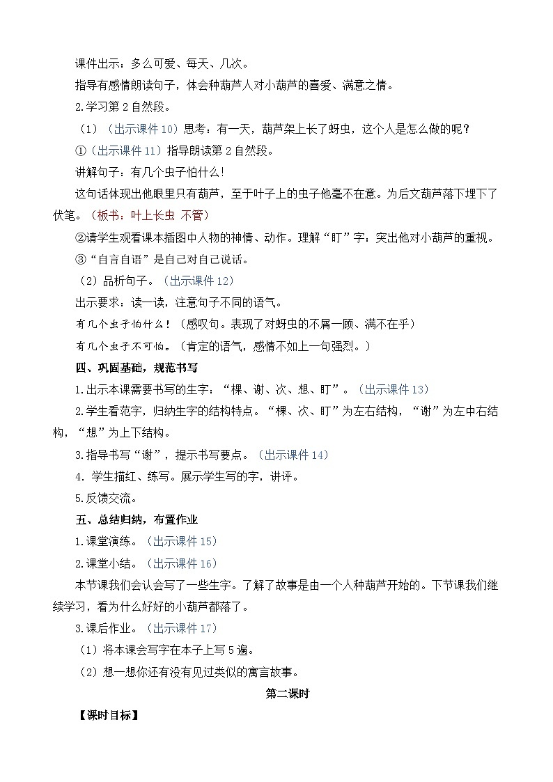关注生字:本课需要认识“葫、芦”等11个生字,因为生字都是合体字,可采用熟字加偏旁的方法掌握。本课需要书写“棵、谢”等10个生字,可以根据字的结构进行归类学习,从整体上把握书写规律。