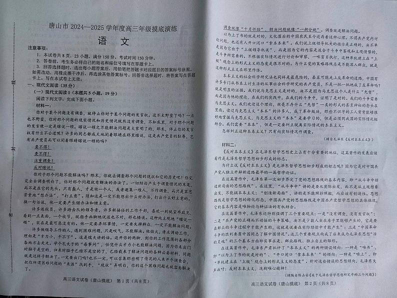 河北省唐山市2024-2025学年高三上学期开学考试语文试题