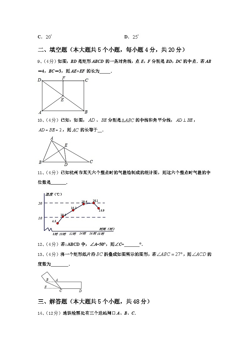 9、(4分)如图,BD是矩形ABCD的一条对角线,点E,F分别是BD,DC的中点.若AB=4,BC=3,则AE+EF的长为_____.