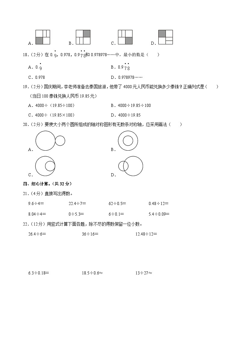 1.(2分)计算小数除法时,要注意 商 的小数点必须和 被除数 的小数点对齐.