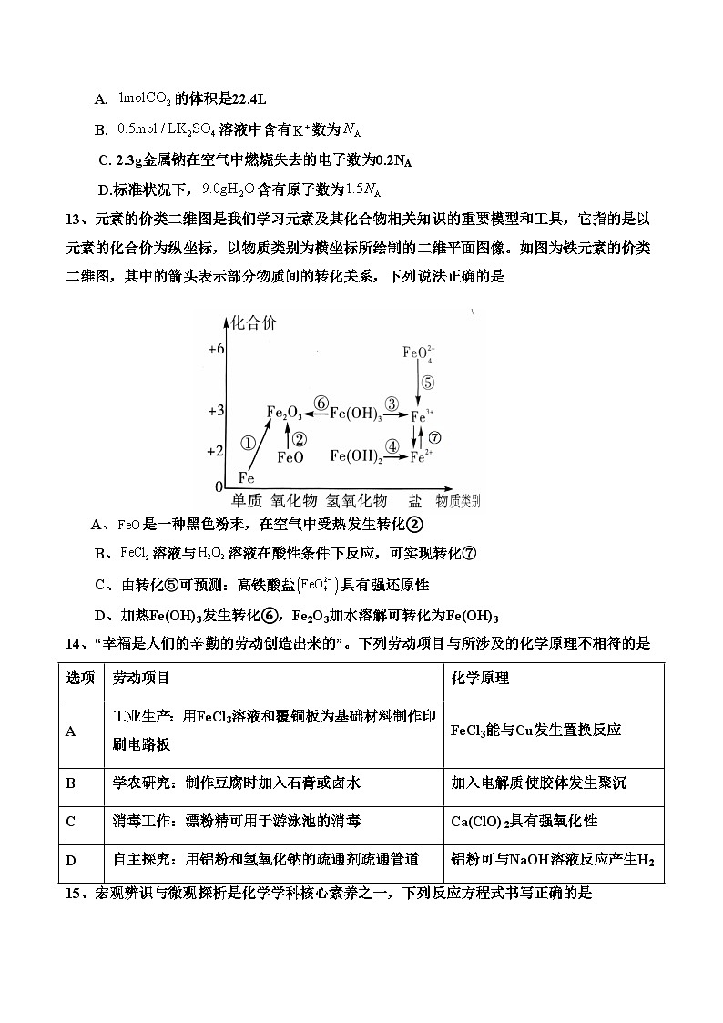 13、元素的价类二维图是我们学习元素及其化合物相关知识的重要模型和工具,它指的是以元素的化合价为纵坐标,以物质类别为横坐标所绘制的二维平面图像。如图为铁元素的价类二维图,其中的箭头表示部分物质间的转化关系,下列说法正确的是