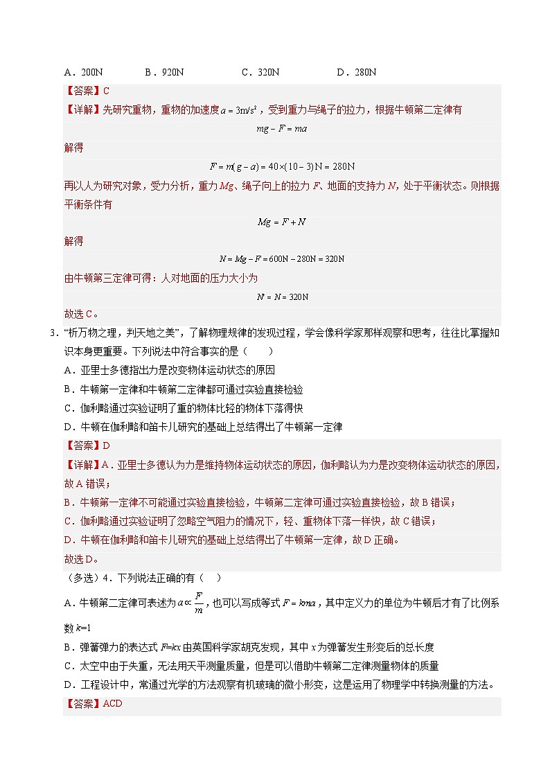 2.如图,质量为60kg的人站在水平地面上,用定滑轮装置将质量为的重物送入井中。当重物以的加速度加速下落时,忽略绳子和定滑轮的质量及绳子与定滑轮间的摩擦,则人对地面的压力大小为(g取)( )
