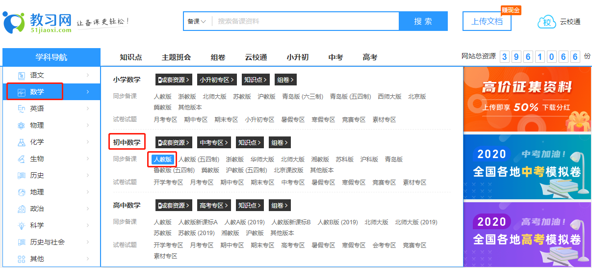 注意左侧的学科导航,将鼠标移动到初中数学科目,选择人教版。