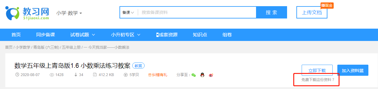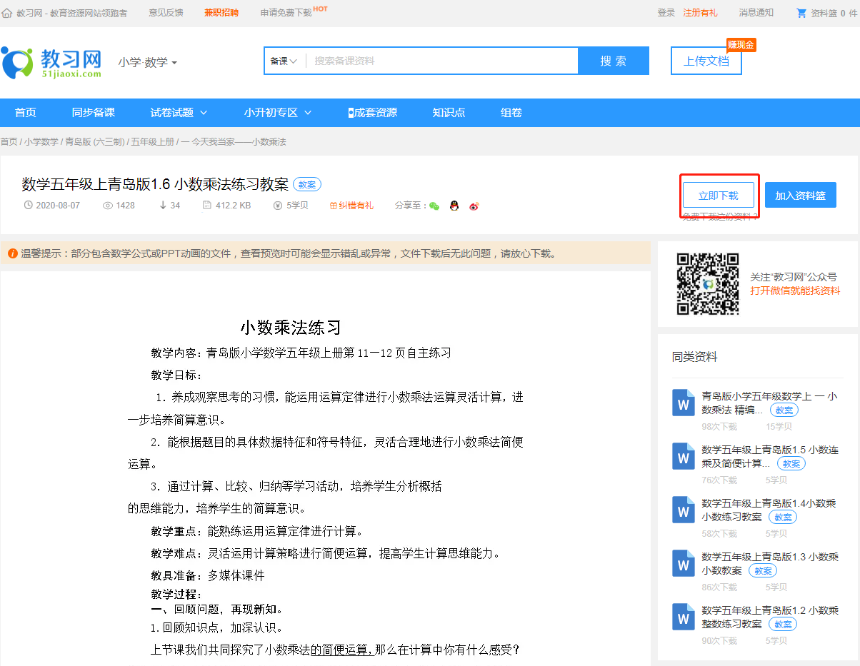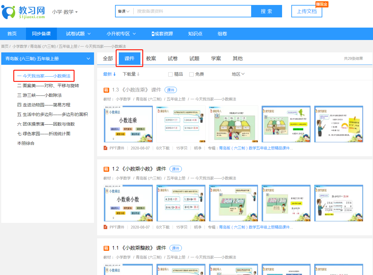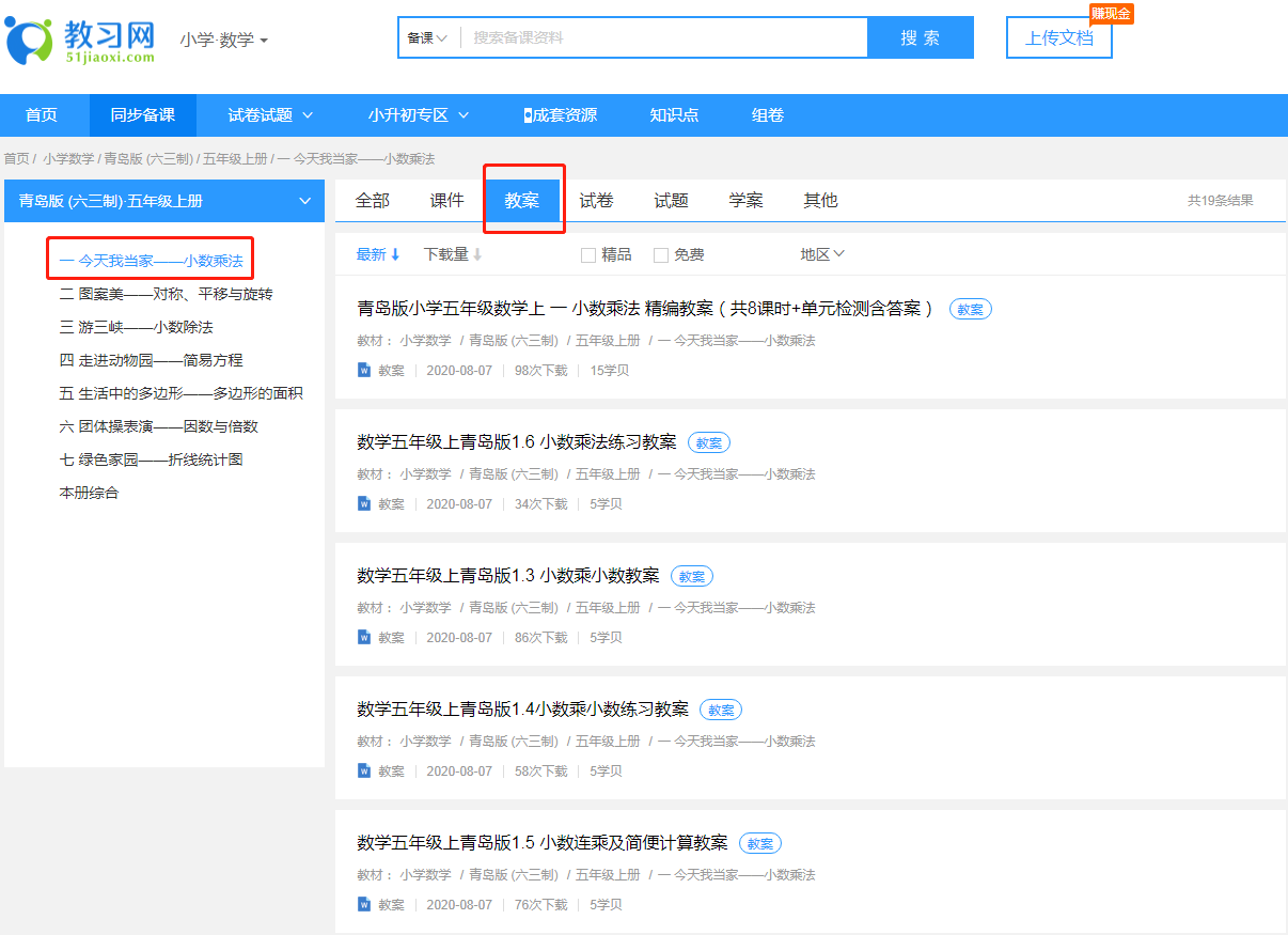 五年级的数学老师想要下载同步教案应该去哪里下载呢?今天小编手把手教学,下面,我以找青岛版(六三学制)数学五年级上册《今天我当家——小数乘法》同步教案为例,给大家做详细介绍。