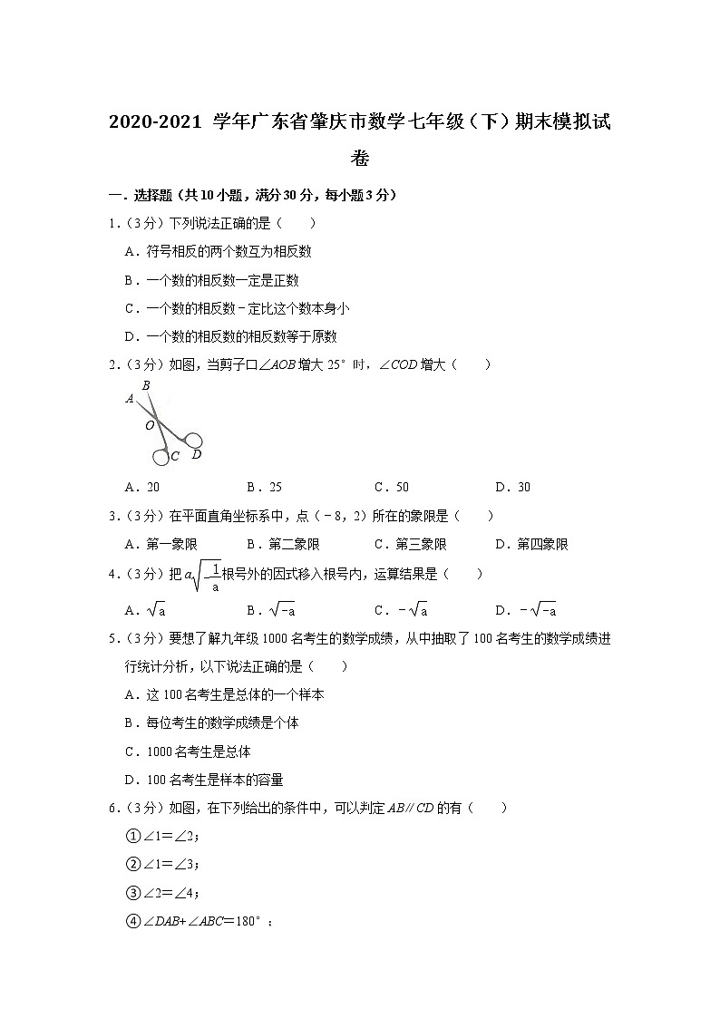 2020-2021学年广东省肇庆市七年级数学(下)期末模拟试卷(word版 含答案)