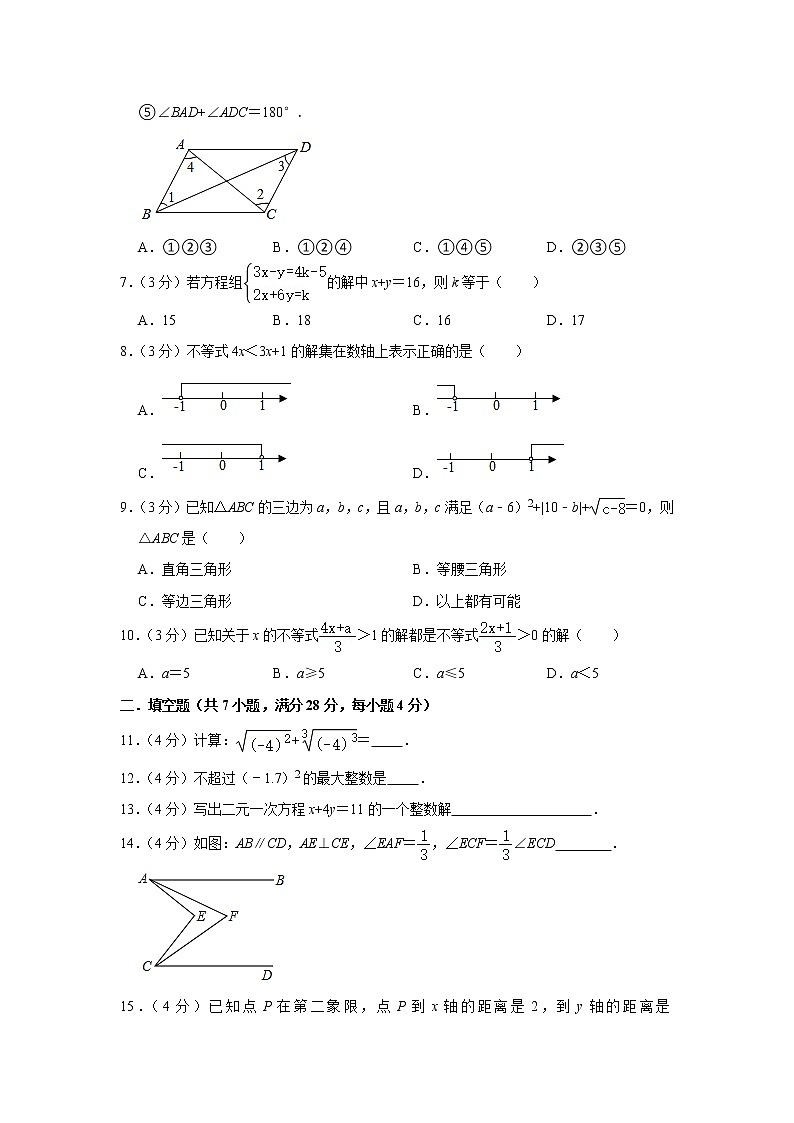 7.(3分)若方程组的解中x+y=16,则k等于( )