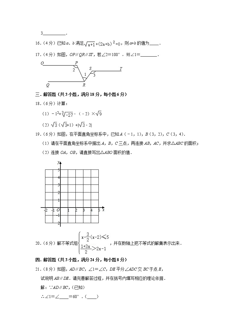21.(8分)如图,AD∥BC,∠1=∠C,DE平分∠ADC交BC于点E,