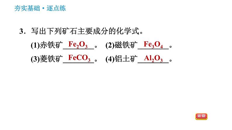 3.写出下列矿石主要成分的化学式。(1)赤铁矿________。 (2)磁铁矿________。(3)菱铁矿________。 (4)铝土矿________。