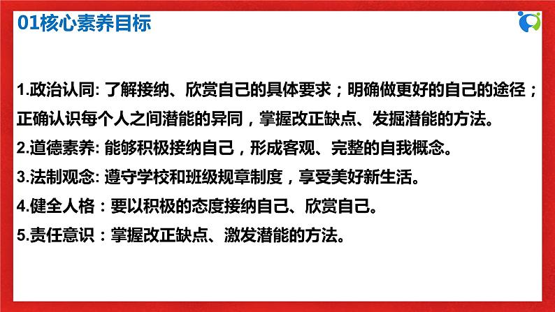 知识目标:了解接纳、欣赏自己的具体要求;明确做更好的自己的途径:正确认识每个人之间潜能的异同,掌握改正缺点、发掘潜能的方法。 能力目标:能够积极接纳自己,形成客观、完整的自我概念;掌握改正缺点、激发潜能的方法。 情感、态度与价值观目标:要以积极的态度接纳自己、欣赏自己。