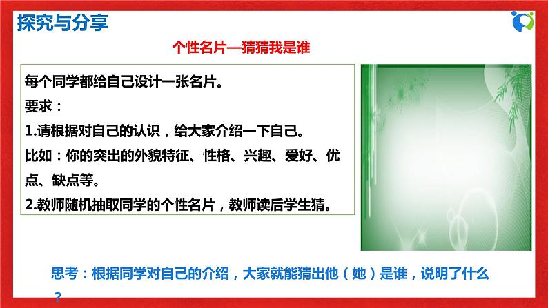 每个同学都给自己设计一张名片。要求:1.请根据对自己的认识,给大家介绍一下自己。比如:你的突出的外貌特征、性格、兴趣、爱好、优点、缺点等。2.教师随机抽取同学的个性名片,教师读后学生猜。