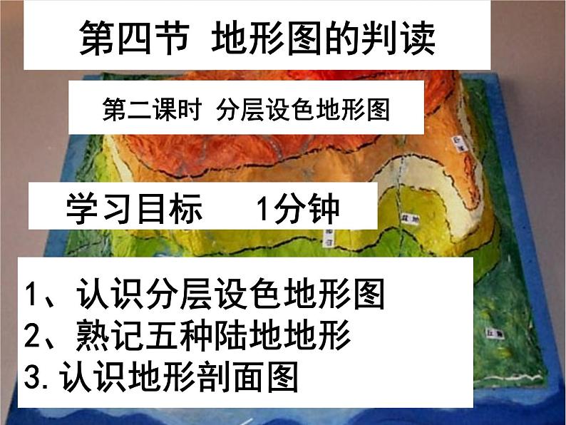 这是一份初中地理人教版 (新课标)七年级上册第一章 地球和地图第四节 地形图的判读图片课件ppt,共21页。PPT课件主要包含了第四节地形图的判读,学习目标1分钟,中间低,课本P28,当堂训练,完成练习册剩下内容等内容,欢迎下载使用。
