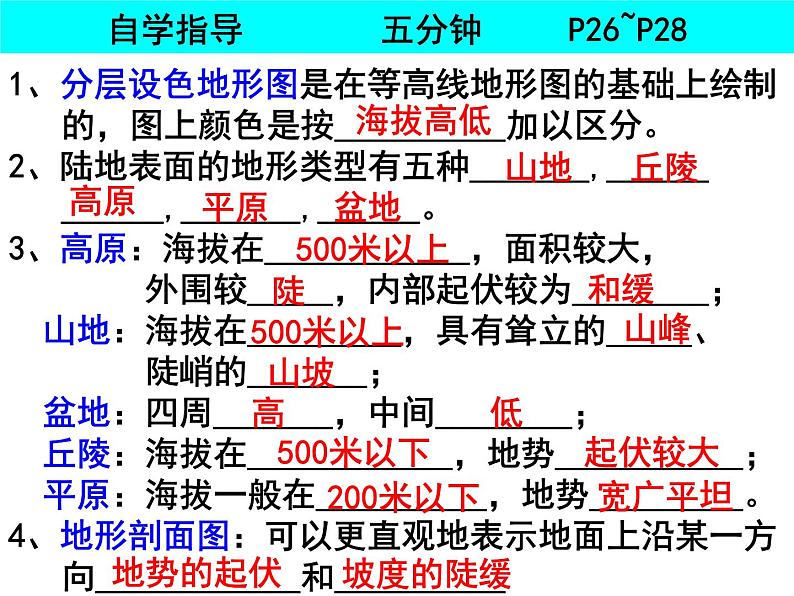 1、分层设色地形图是在等高线地形图的基础上绘制的,图上颜色是按__________加以区分。2、陆地表面的地形类型有五种_______,______ ______,_______,______。3、高原:海拔在____________,面积较大, 外围较_____,内部起伏较为________; 山地:海拔在_________,具有耸立的_____、 陡峭的_______; 盆地:四周_______,中间________; 丘陵:海拔在____________,地势___________; 平原:海拔一般在__________,地势_________。4、地形剖面图:可以更直观地表示地面上沿某一方向____________和__________