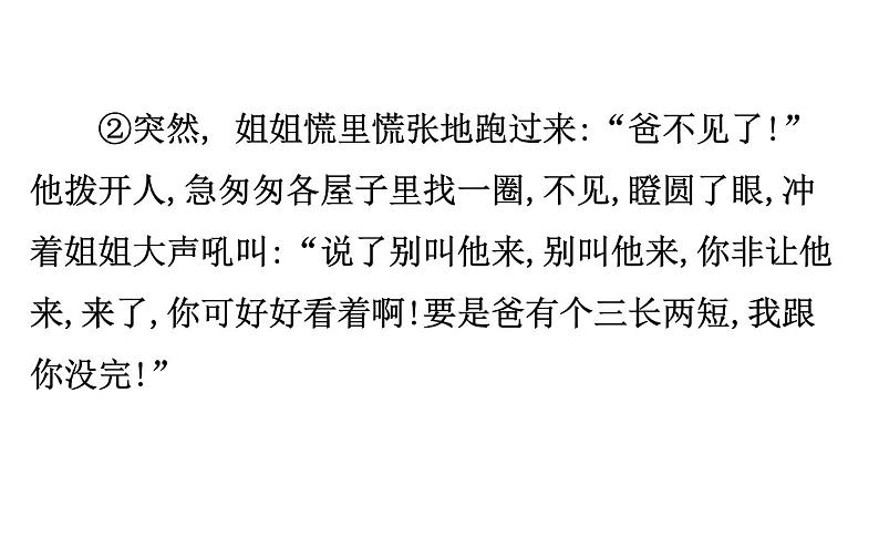 ②突然, 姐姐慌里慌张地跑过来:“爸不见了!”他拨开人,急匆匆各屋子里找一圈,不见,瞪圆了眼,冲着姐姐大声吼叫:“说了别叫他来,别叫他来,你非让他来,来了,你可好好看着啊!要是爸有个三长两短,我跟你没完!”