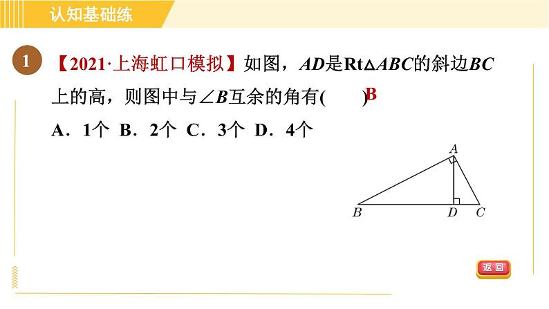 【2021·上海虹口模拟】如图,AD是Rt△ABC的斜边BC上的高,则图中与∠B互余的角有( )A.1个 B.2个 C.3个 D.4个