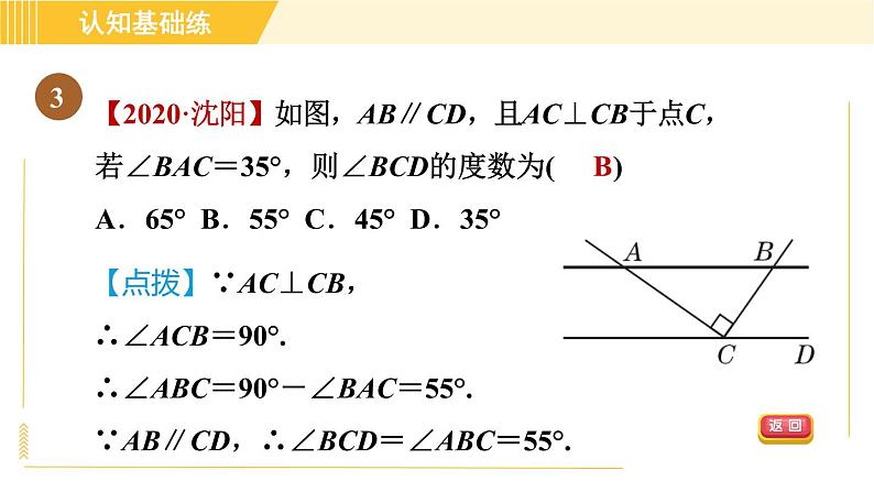【2020·沈阳】如图,AB∥CD,且AC⊥CB于点C,若∠BAC=35°,则∠BCD的度数为( )A.65° B.55° C.45° D.35°